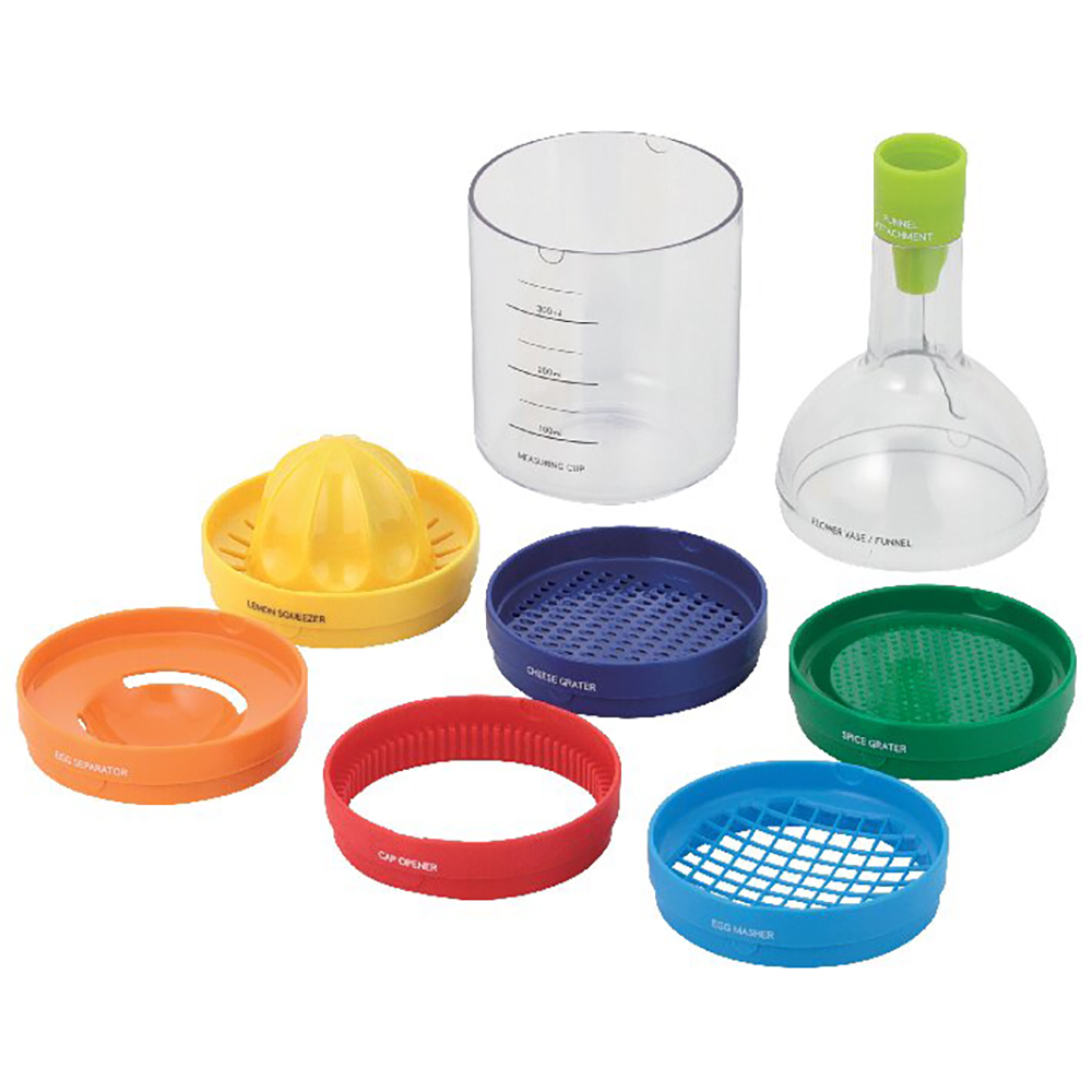 便利なキッチンツール(ロートアタッチメント、ロート、レモン搾り、薬味おろし、玉子つぶし、チーズ削り、キャップオープナー、黄身取り、計量カップ)が一つにまとまりました。