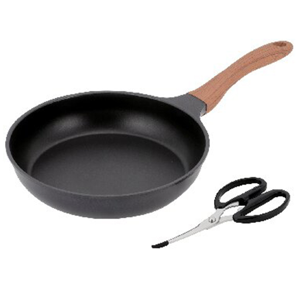 商品材料:フライパン/本体:アルミニウム合金(フッ素樹脂加工)、底部:鉄、持手:フェノール樹脂、キッチン鋏/刃:ステンレス刃物鋼、ハンドル:ABS樹脂、刃先ガード:ナイロン
