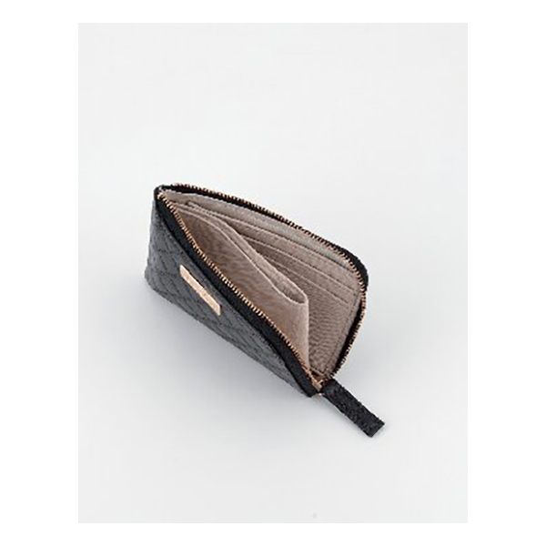 開口部:ファスナー式、内部:2室・オープン式小銭入・カード入6。空いたスペースに折りたたんだお札も収納可能。