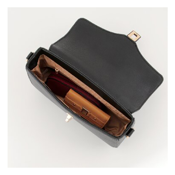 開口部:被せターンロック式、外部:ファスナーポケット1、内部:オープンポケット2・ファスナーポケット1、ショルダーベルト付(着脱可・長さ調節可)。チャームポーチ付。