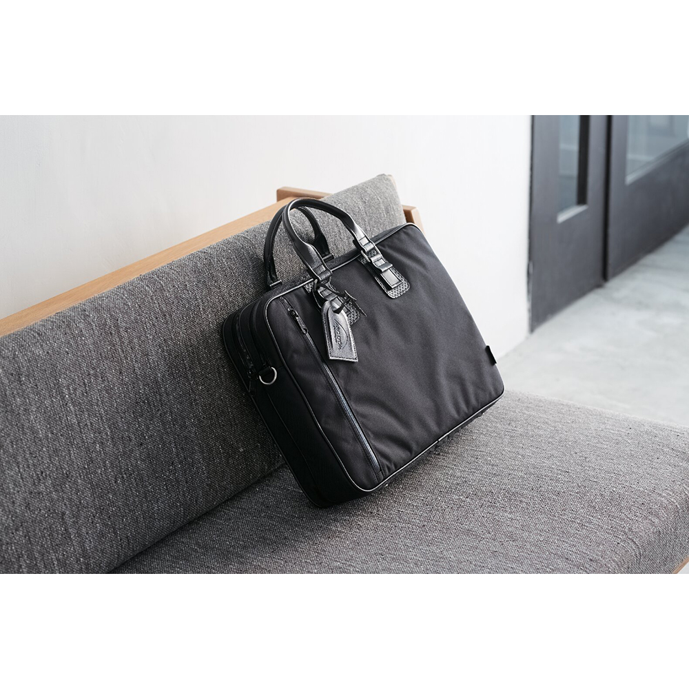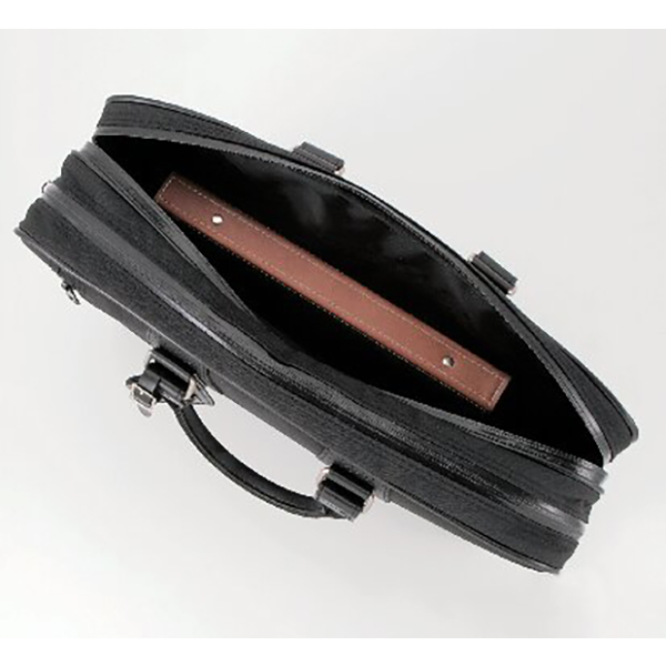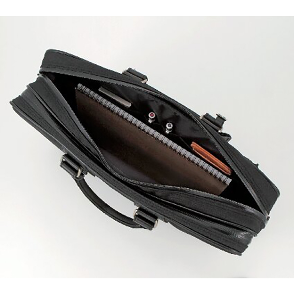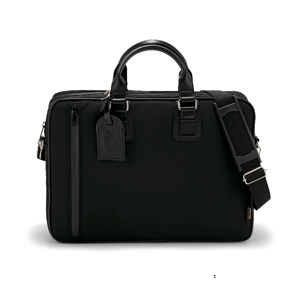 B4ファイルサイズ対応。開口部:ファスナー式、外部:ファスナーポケット1、内部:オープンポケット2・ファスナーポケット1・ペン差し2、ショルダーベルト付(着脱可・長さ調節可)。本体生地には、アウトドア製品にも使われるコーデュラ(R)の生地にさらにテフロン加工を施しています。また止水ファスナーを使用しています。完全防水ではありません。