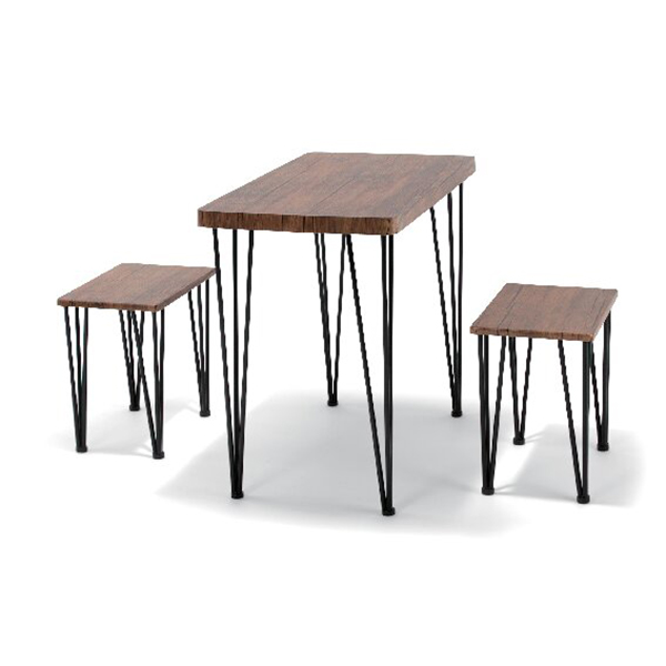 耐荷重:天板約30Kg、チェア約80Kg、お客様組立品。木目調の天板とブラックのアイアンを組み合わせたデザインのダイニングセット。