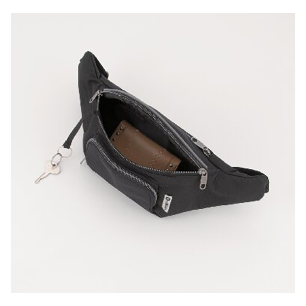 開口部:ファスナー式、外部:ファスナーポケット2、内部:オープンポケット1、ウエストベルト着脱不可(長さ調節可)。反射素材が付いたスポーティなウエストポーチ。財布やスマートフォン、キーケースなどちょっとした外出時にも便利なサイズ感です。