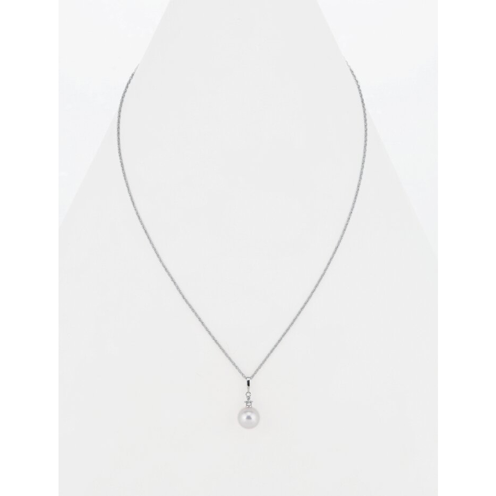 商品材料:トップ:アコヤ真珠・K10ホワイトゴールド・ダイヤモンド(3石、0.03ct)、チェーン:シルバー925(ロジウムメッキ)