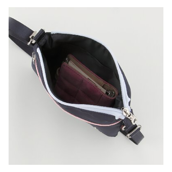 開口部:ファスナー式、外部:ファスナーポケット1、内部:オープンポケット1、ショルダーベルト付(着脱可・長さ調節可)。