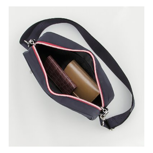 開口部:ファスナー式、外部:ファスナーポケット1、内部:ファスナーポケット1・メッシュオープンポケット2、ショルダーベルト付(着脱可・長さ調節可)。