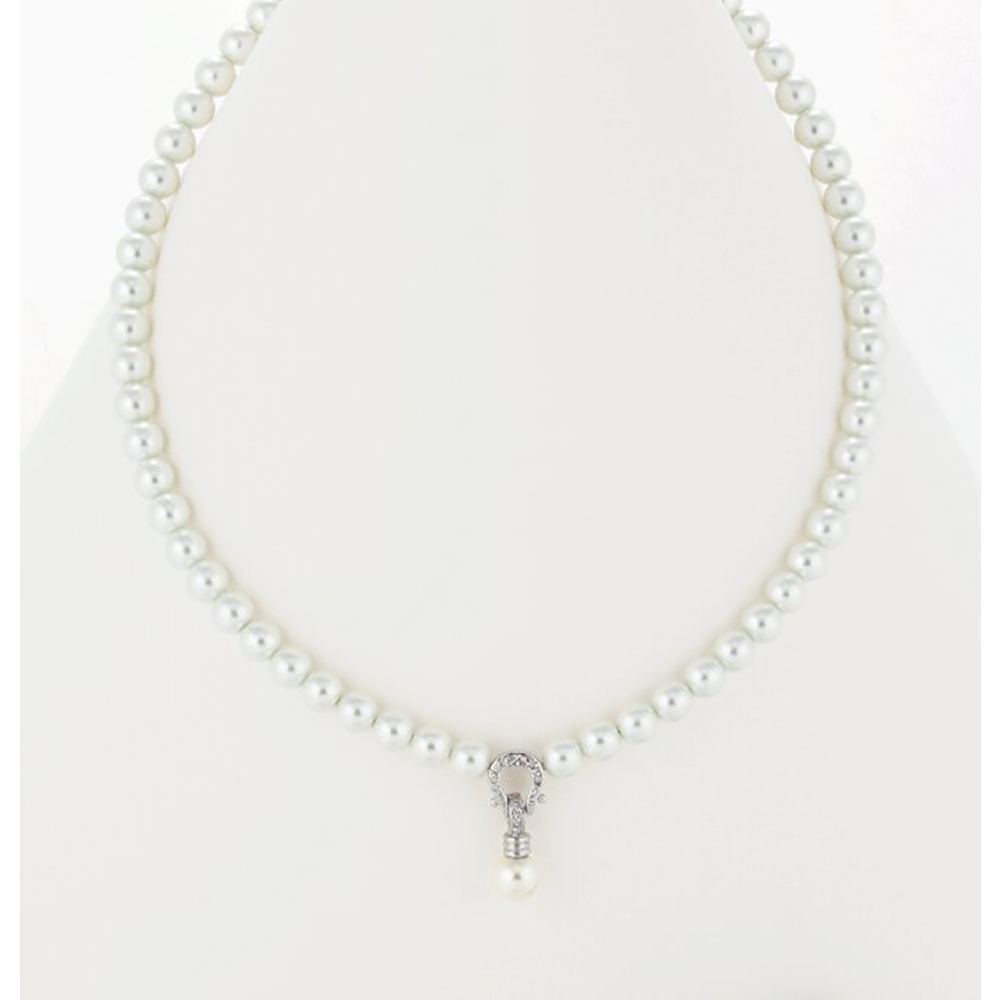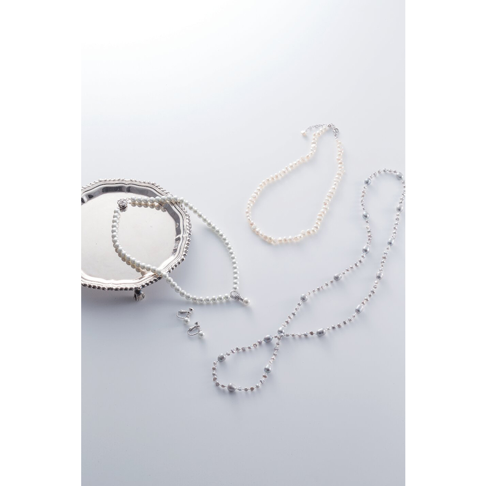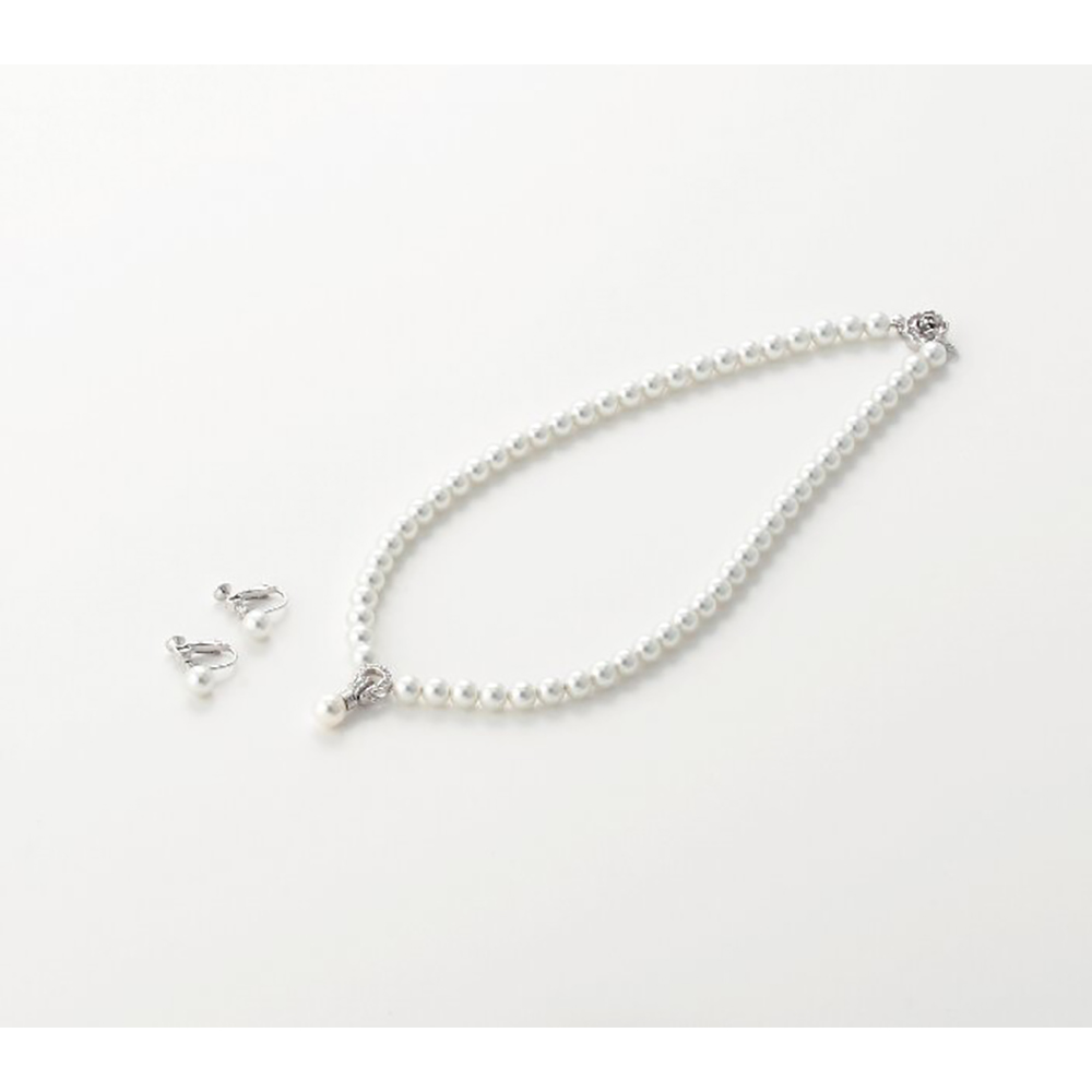 商品材料:玉部分:人工パール(貝パール)、キュービックジルコニア、留具・チェーン:真鍮(ロジウムメッキ)