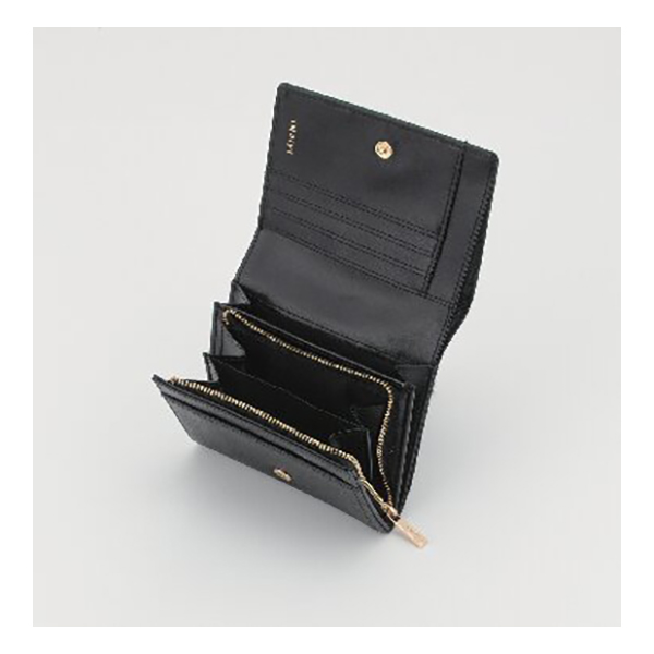 開口部:ホック式、内部:札入1・ファスナー式小銭入(仕切り1)・カード入3・オープンポケット4。