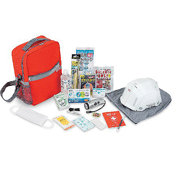 内容:エマージェンシーバッグ、LEDラジオライト、ルミカライト、非常用給水バッグ5L、保存飲料水500ml、サバイバルシート、ポケットコート、IDホイッスル、折りたたみヘルメット、緊急トイレパック各1