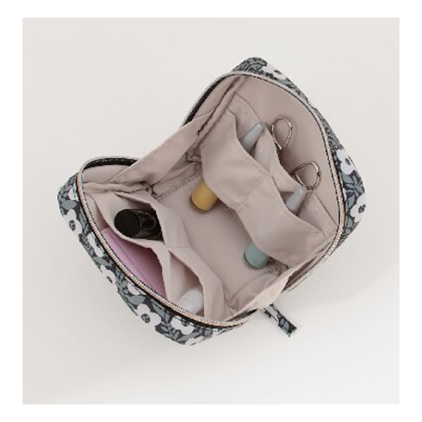 開口部:ファスナー式、内部:オープンポケット3・ホルダー5。北欧デザインの柄が目を引く自立型のスクエアポーチ。開口部が大きく開くので見やすく探しやすい使い勝手の良い形がポイント。メイクグッズはもちろん、サニタリーやガジェットなど様々なシーンで大活躍。