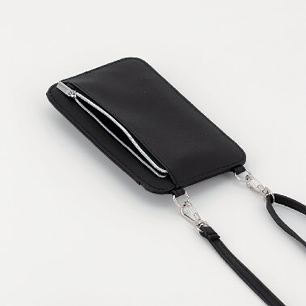 開口部:ファスナー式、外部:オープンポケット1、内部:カード入2、ショルダーベルト付(着脱可・長さ調節可)。お出かけが身軽になるスマートフォンポシェット。スマートフォン、カード、カギなど最低限のアイテムが収納できます。子供との外出や旅行にフェスなど、どんなシーンやスタイルでも使えるシンプルなデザインがポイント。