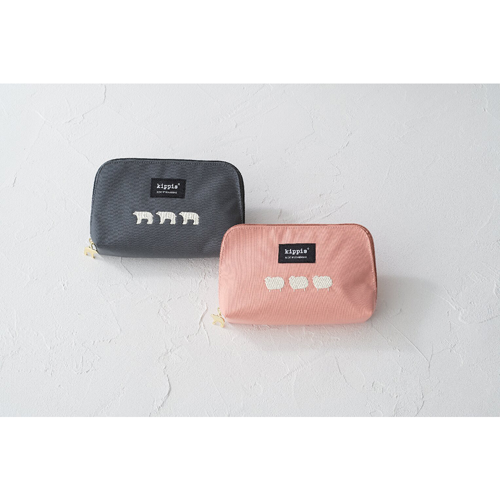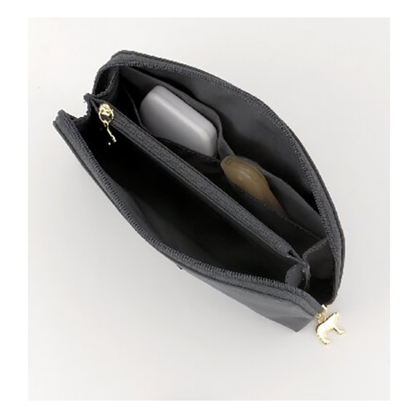 開口部:ファスナー式、内部:オープンポケット3・仕切りファスナーポケット1。細々としたコスメやカード類、母子手帳などまで3つのポケットと仕切りつきポケットにすっきり収納できるポーチ。動物モチーフの刺しゅうがポイントに。