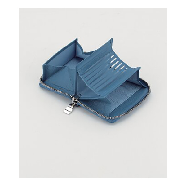 開口部:ファスナー式、内部:カード差し7・折りたたみ小銭入・オープンポケット3。イタリアンレザー使用。背側に沿って縦にスライドすることでお札を折らずに収納できます。カード入れは扇状に広がり、小銭入れもBOX型で大きく開くためお金やカードを素早く出し入れできます。