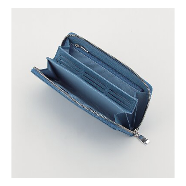 開口部:ファスナー式、外部:オープンポケット1(内部:オープンポケット1)、内部:札入2・ファスナー式小銭入・カード差し15・カード入6・オープンポケット2。イタリアンレザー使用。
