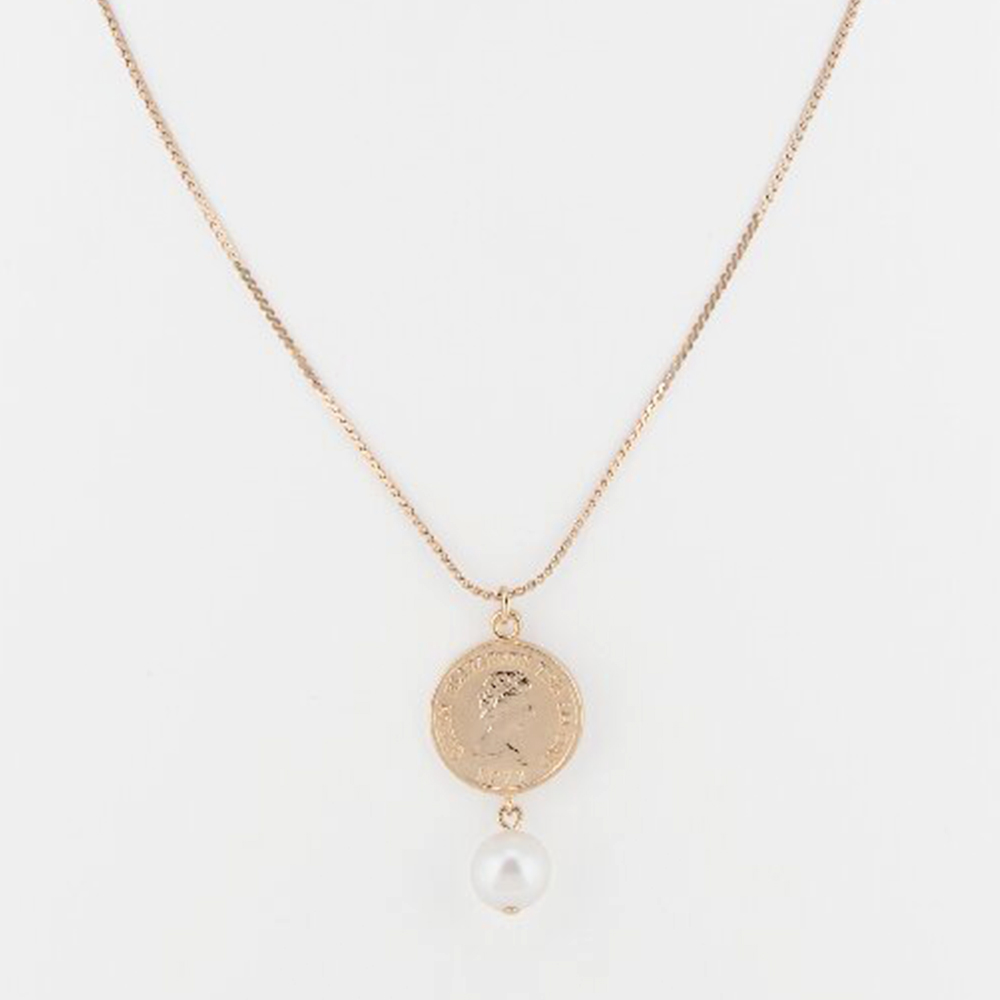 人工パールを組み合わせたデザインが魅力のコインモチーフネックレス。