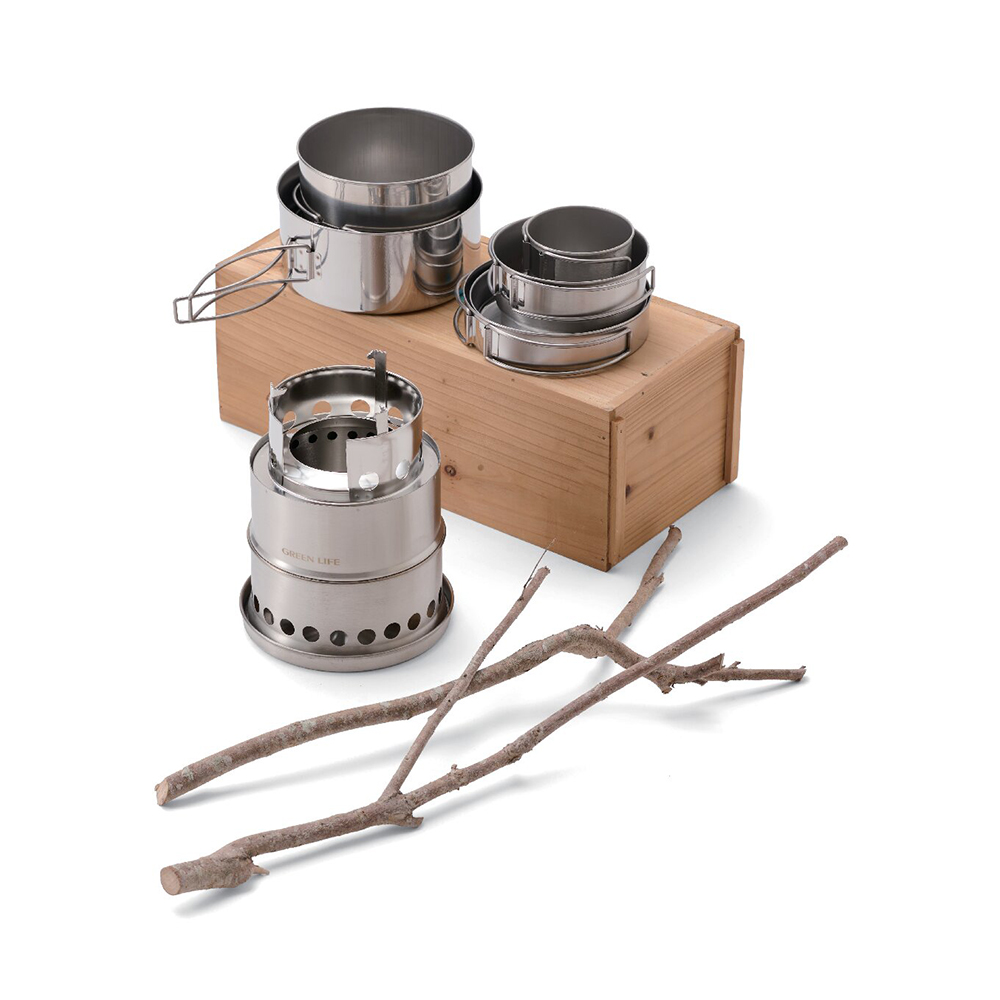 灰受け皿付きで片付けも簡単です。小枝などの自然燃料で火おこし可能。クッカーなどを置けるゴトク付きで調理や湯沸かしに便利です。収納袋付。