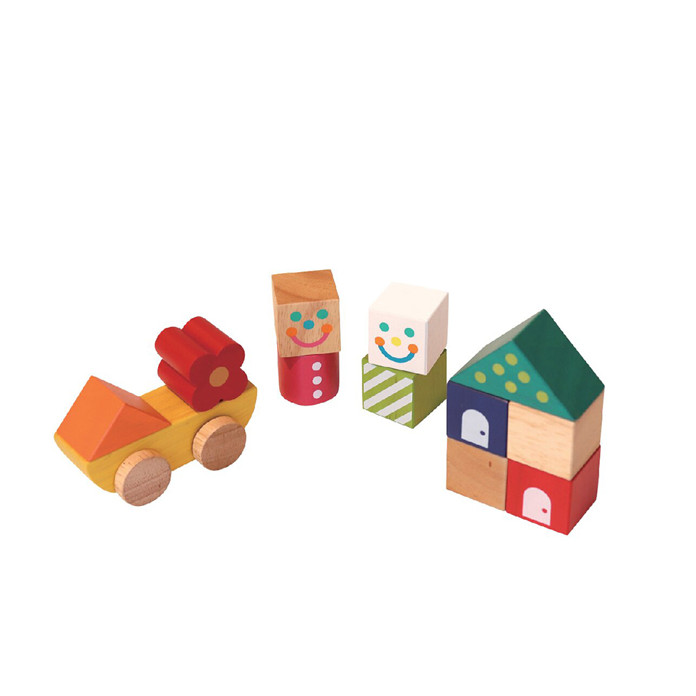 対象年齢:3歳~。おうちやくるまを作って、自分だけのつみきの町を広げよう。見立て遊びを促すカラフルな模様や色が特長のつみきセット。
