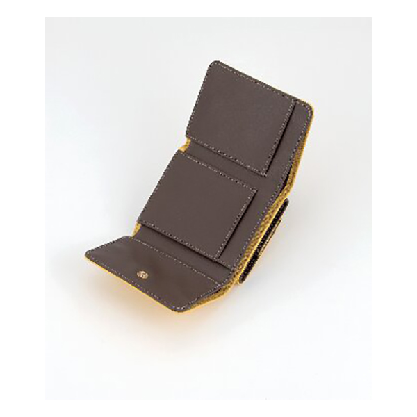開口部:ホック式、外部:ホック式小銭入、内部:札入1・カード入2・オープンポケット1。コンパクトで持ち運びに便利な三つ折りの財布です。