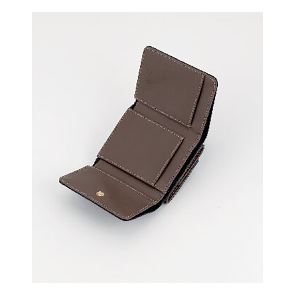 開口部:ホック式、外部:ホック式小銭入、内部:札入1・カード入2・オープンポケット1。コンパクトで持ち運びに便利な三つ折りの財布です。