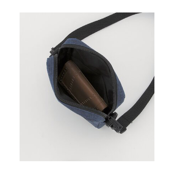 開口部:ファスナー式、外部:ファスナーポケット1、内部:オープンポケット1、ショルダーベルト付(着脱可・長さ調節可)。