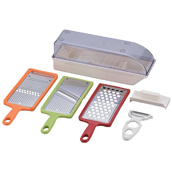 内容:スライサー、千切り・つま切り、おろし、ピーラー、ホルダー、収納ケース、容器各1