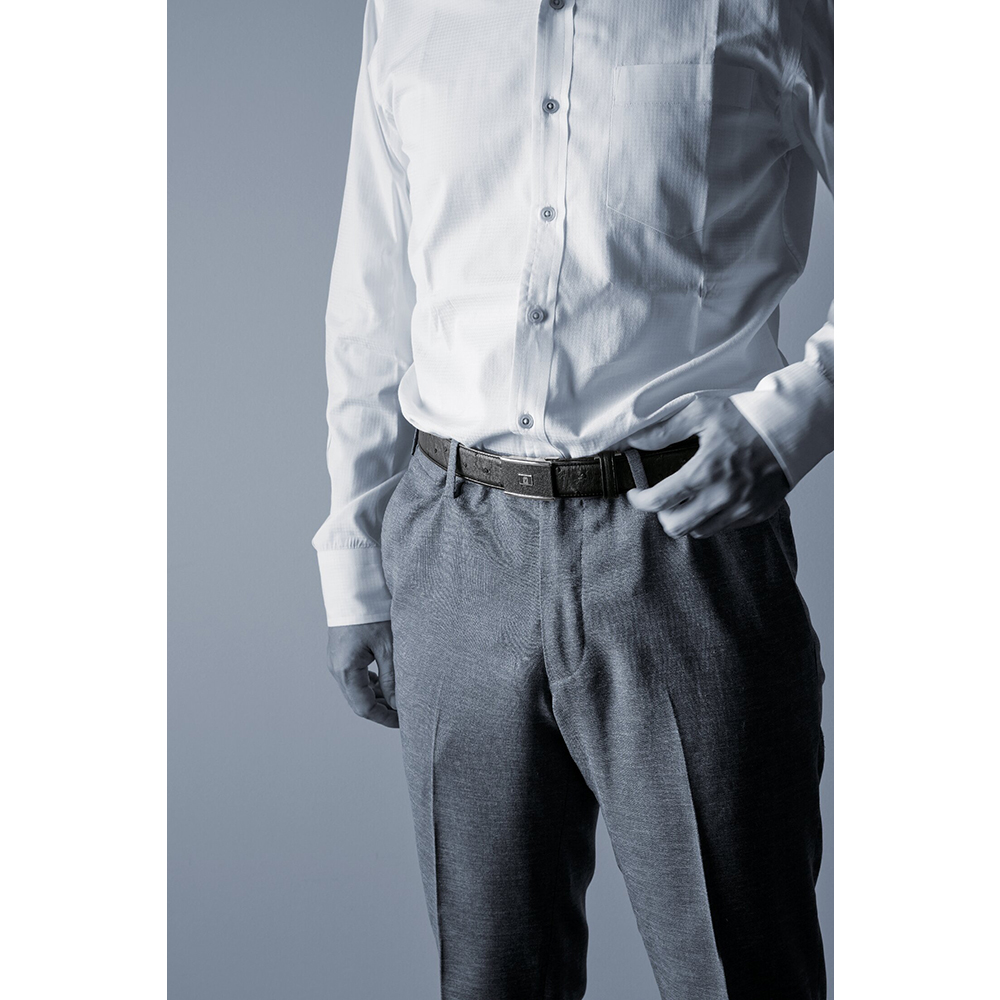 長さ調整可。革を傷めにくく、ベルトのどの位置でも止まるように作られたバックルを使用しています。
