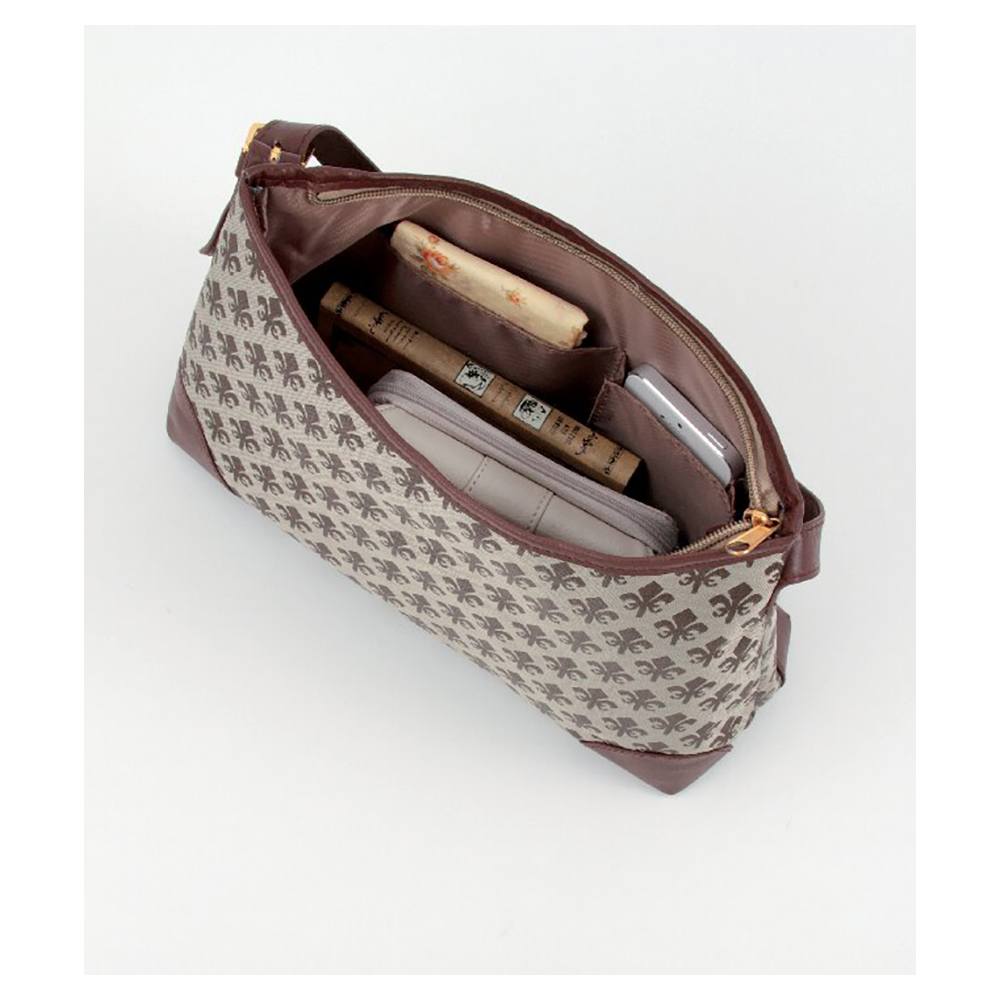 開口部:ファスナー式、内部:オープンポケット2、ショルダーベルト着脱不可(長さ調節可)。ユリ柄が印象的なセミショルダーバッグです。