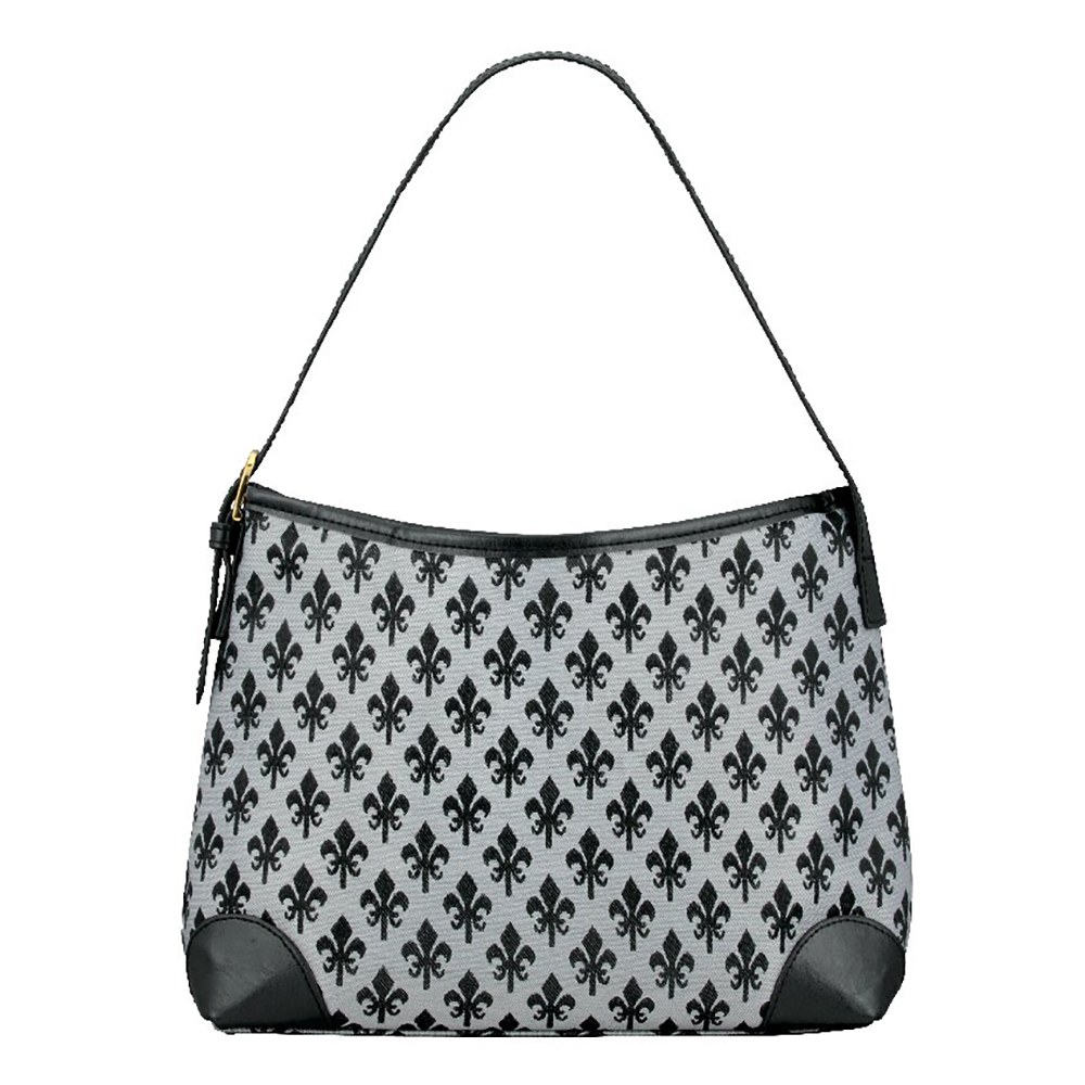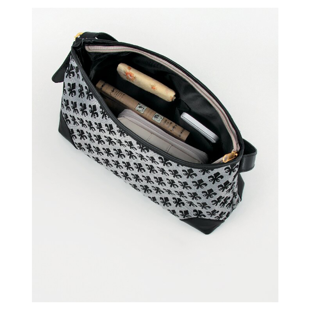 開口部:ファスナー式、内部:オープンポケット2、ショルダーベルト着脱不可(長さ調節可)。ユリ柄が印象的なセミショルダーバッグです。