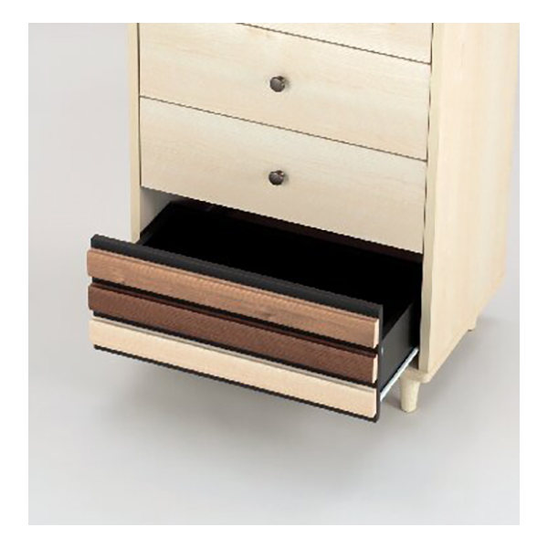総耐荷重約40Kg、お客様組立品。引出しの3色デザインが特徴的なデザイン家具。アンティーク調の取手もポイントです。天然木のような風合いのシートを採用。