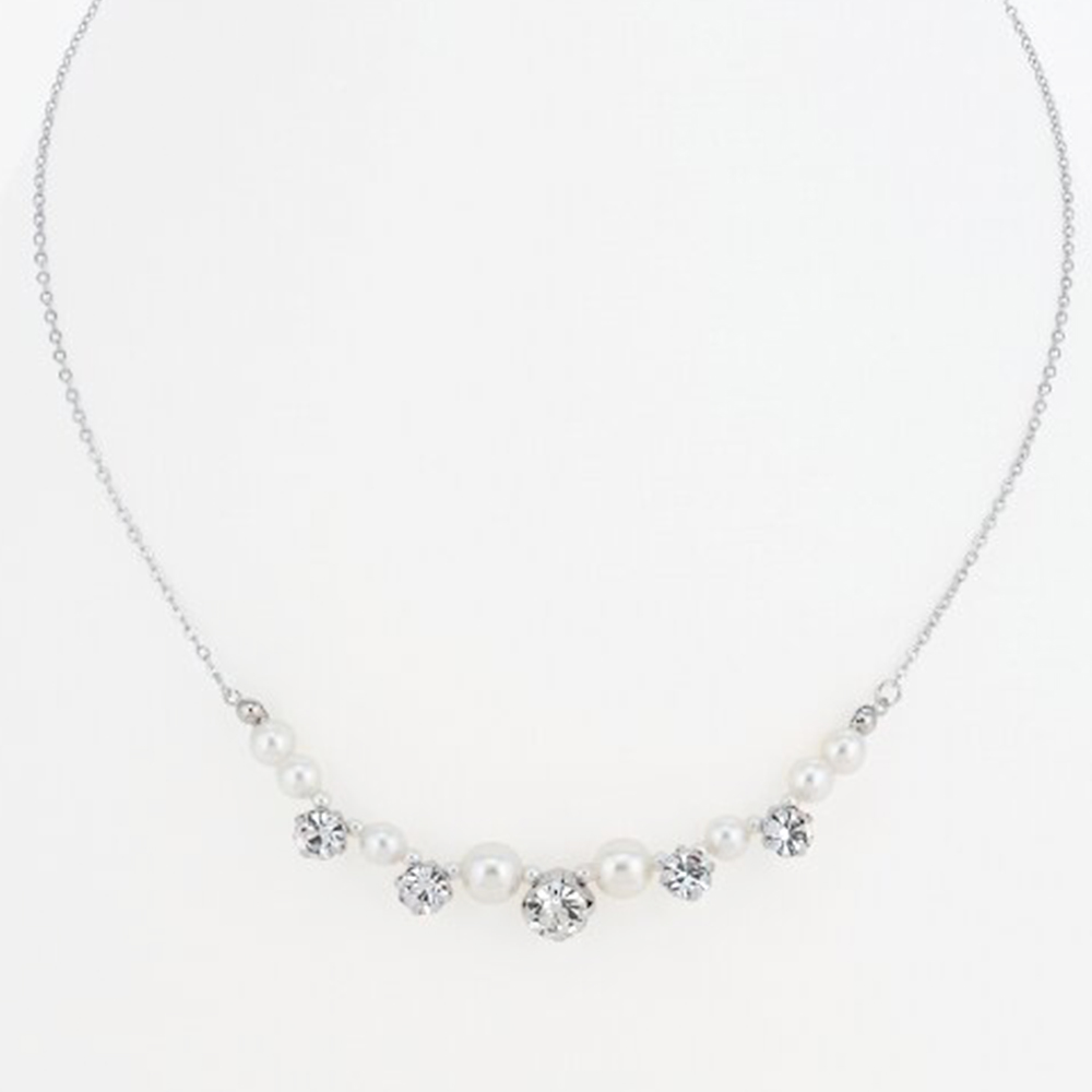胸元を美しくみせる、ガラスと人工パールがミックスしたネックレスです。