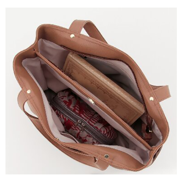 開口部:ファスナー式・マグネット式、外部:オープンポケット2・ファスナーポケット1・マグネット式ポケット1、内部:オープンポケット2・ファスナーポケット1。A4が入る大きさのトートバッグです。