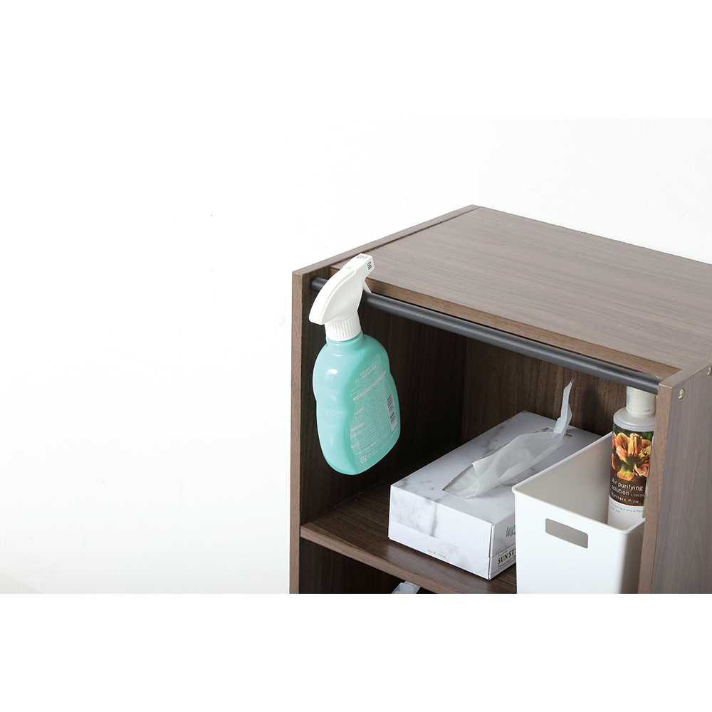 耐荷重:天板約15Kg、棚板約10Kg、お客様組立品。シンプルなデザインの収納ボックスです。パイプハンガー付ですので物を掛けることができます。棚板は固定になります。