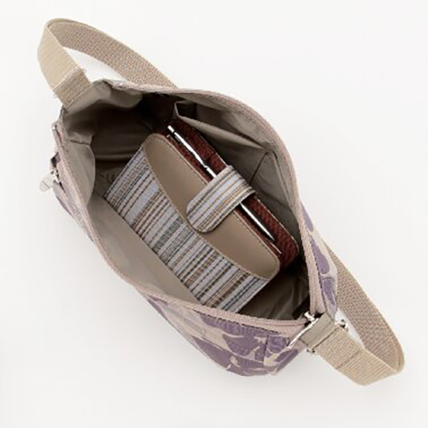 開口部:ファスナー式、外部:ファスナーポケット1、内部:オープンポケット2、ショルダーベルト着脱不可(長さ調節可)。柄の出方が一つひとつ異なる場合があります。見る角度によって光沢が変化する高級感漂うジャカード織。糸にこだわり、柄からデザインして軽くて丈夫なジャカード生地を群馬県桐生市でしっかり織り上げました。