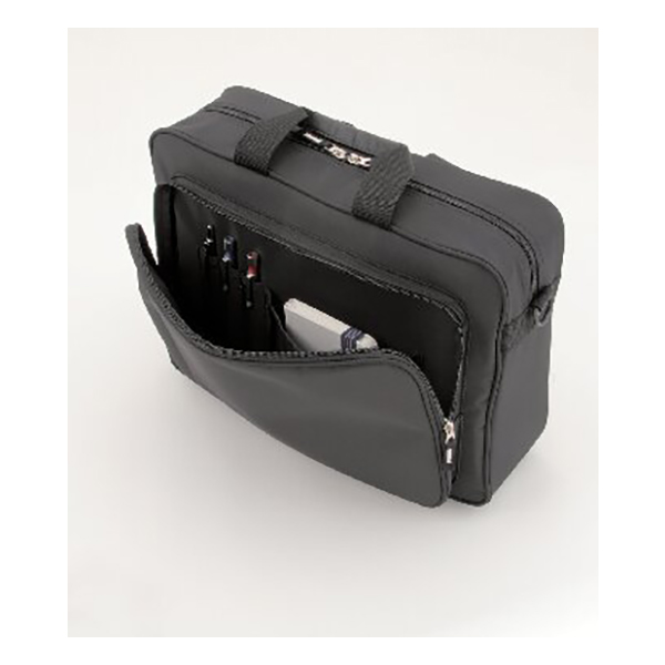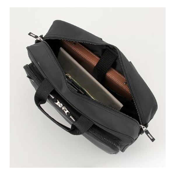 A4ファイルサイズ対応。開口部:ファスナー式、外部:ファスナーポケット2、内部:オープンポケット2・ペン差し3、ショルダーベルト付(着脱可・長さ調節可)。本体にはウレタン入りで軽い衝撃を緩和。タブレットなどの収納にも安心です。脱着式のショルダーベルト付きで手提げとショルダーの2WAYとしてご使用できます。背面にはキャリーバッグに装着できるループが付いた、シンプルさと必要とされる収納を備えたビジネスバッグです。