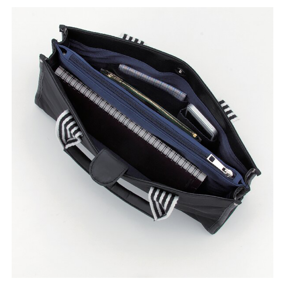 A4ファイルサイズ対応。開口部:マグネット式、外部:オープンポケット2、内部:オープンポケット2・ファスナーポケット1・仕切りファスナーポケット1。