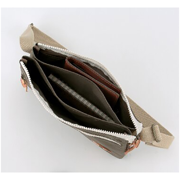 開口部:ファスナー式、外部:ファスナーポケット1、内部:3室、オープンポケット2、ショルダーベルト着脱不可(長さ調節可)。薄マチでコンパクトな柔らかい風合いのサコッシュ。