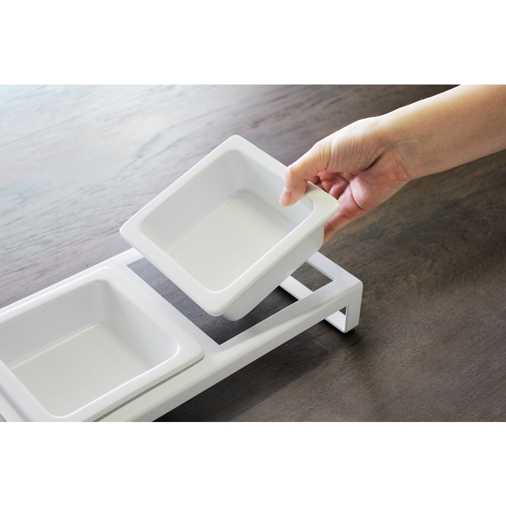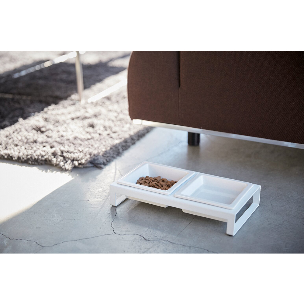 お水や2種類のフードなど、自由に組み合わせて使えるボウルとスタンドのセット。ボウルはスタンドから取り外し可能。ご飯が終わったら簡単に洗えます。