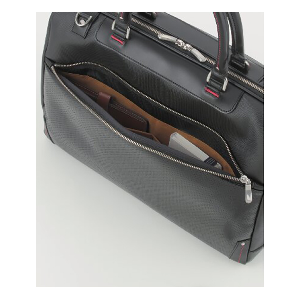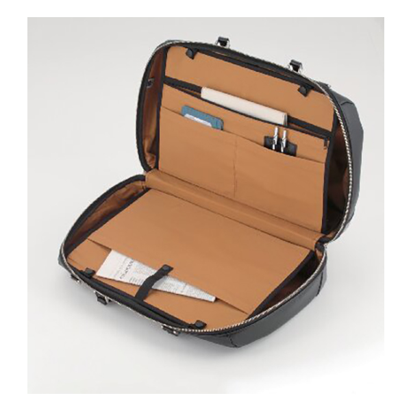 B4ファイルサイズ対応。開口部:ファスナー式、外部:オープンポケット1・ファスナーポケット1(内部:オープンポケット2)、内部:オープンポケット3・ファスナーポケット2・ホック式ポケット1・ペン差し2・仕切り2、ショルダーベルト付(着脱可・長さ調節可)。国産(兵庫県豊岡市)の商品。フルオープンタイプで大きく開閉可能。目隠しにもなる中仕切りにはポケット類が充実。中仕切りは必要に応じて取り外しが可能。