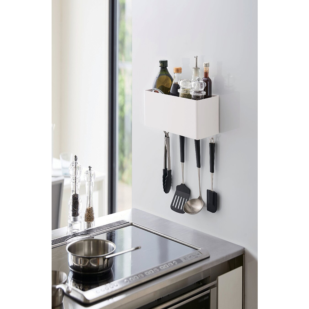 耐荷重約3Kg(本体:約2Kg、フック1つあたり:約250g)。マグネットが付く冷蔵庫やパネルに簡単取り付けの収納ケース。キッチン・バスルーム・ランドリー・オフィスなど、使い方はアイデア次第です。