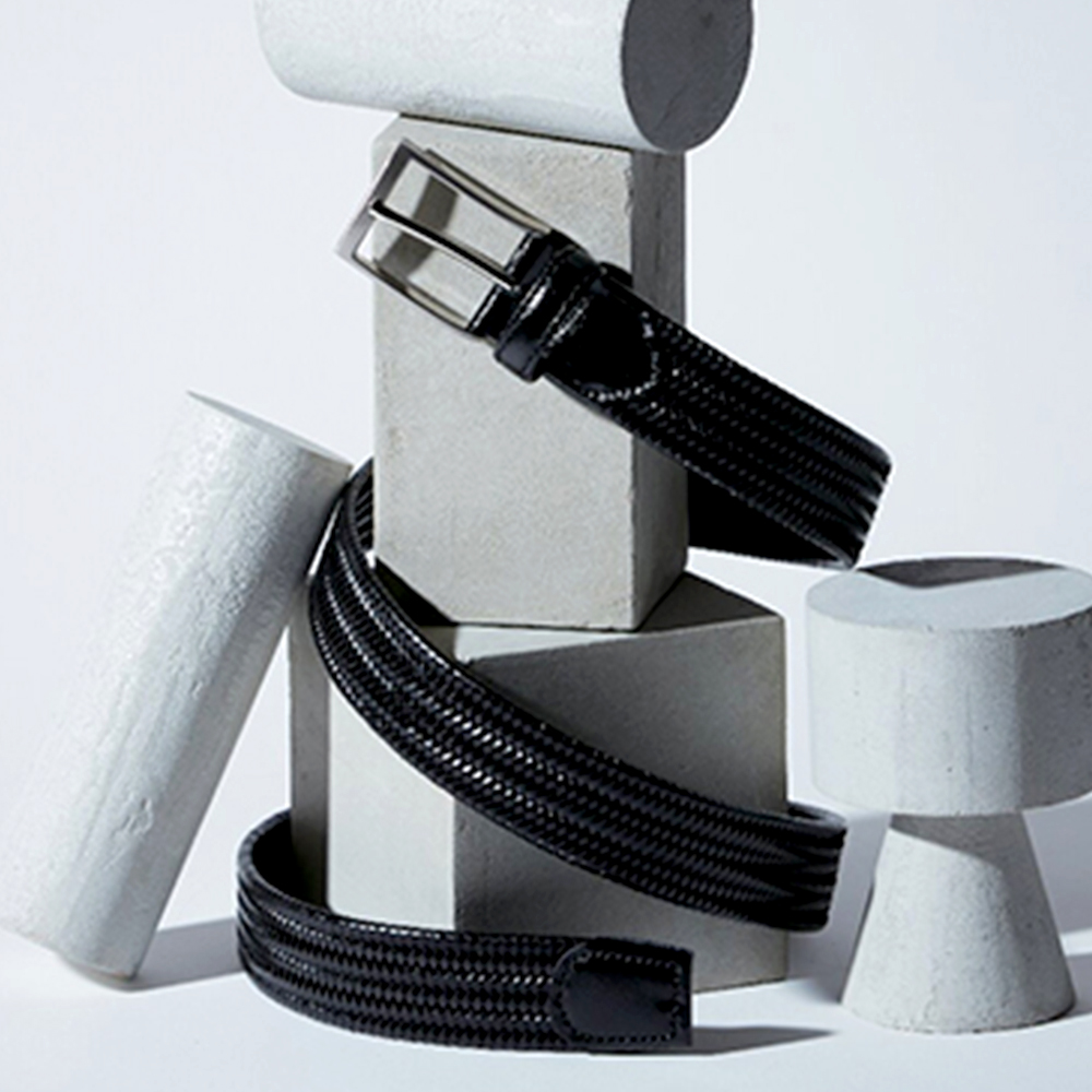 ピン式、長さ調節不可。ドイツ製の再生皮革を使用し、革ですが伸縮するベルトです。