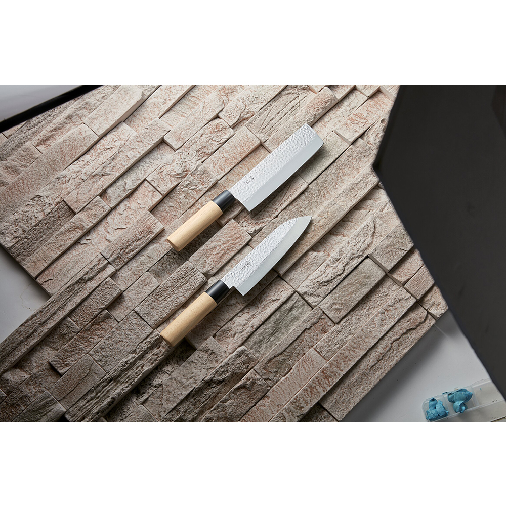 手作り品の為、サイズが異なる場合があります。日本でも有数の刃物の町、岐阜県関市で造られた包丁です。伝統的な鎚目模様の古流仕上げの包丁です。柄には握ったときに温かみがあり、手に馴染みやすい天然木を使用しました。