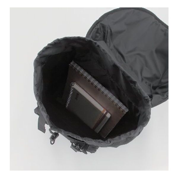 開口部:バックル式(巾着式)、外部:ファスナーポケット2・被せバックル式ポケット1。