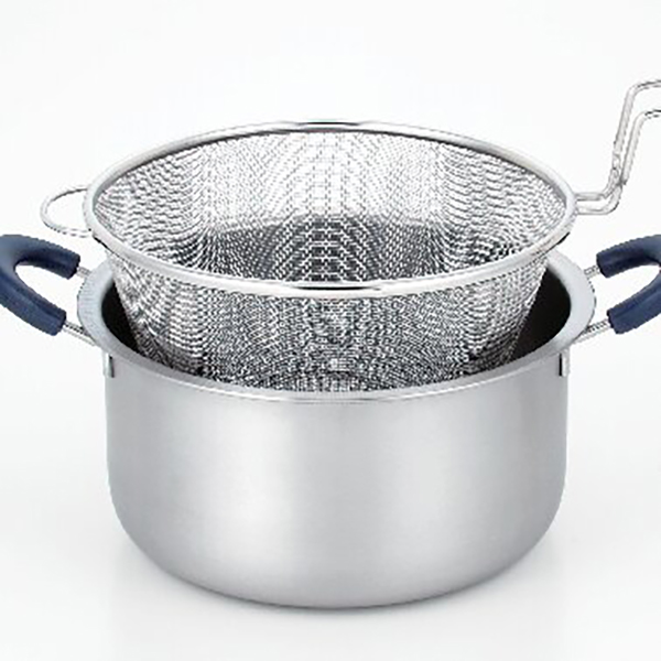商品材料:深型鍋/本体:ステンレス鋼、持手・ツマミ:メラミン樹脂、ザル/本体:ステンレス鋼、持手:天然木、深型フライパン/本体:アルミニウム合金(フッ素樹脂加工・ダイヤモンドコート)、底部:鉄溶射加工、持手:フェノール樹脂