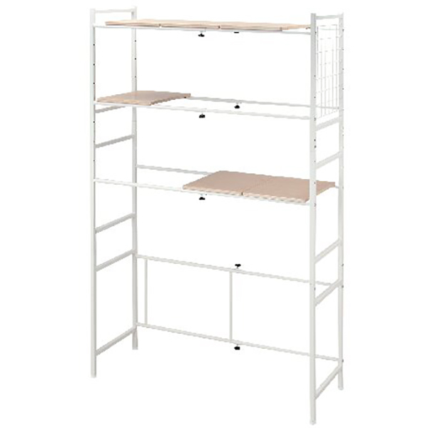 総耐荷重約20Kg、お客様組立品。横幅、棚の高さ、配置を調節できます。6枚の棚板は自由に配置でき、2枚並べて棚を3段にすることもできます。空いたスペースにはカゴを置いたりハンガー掛けに使えます。