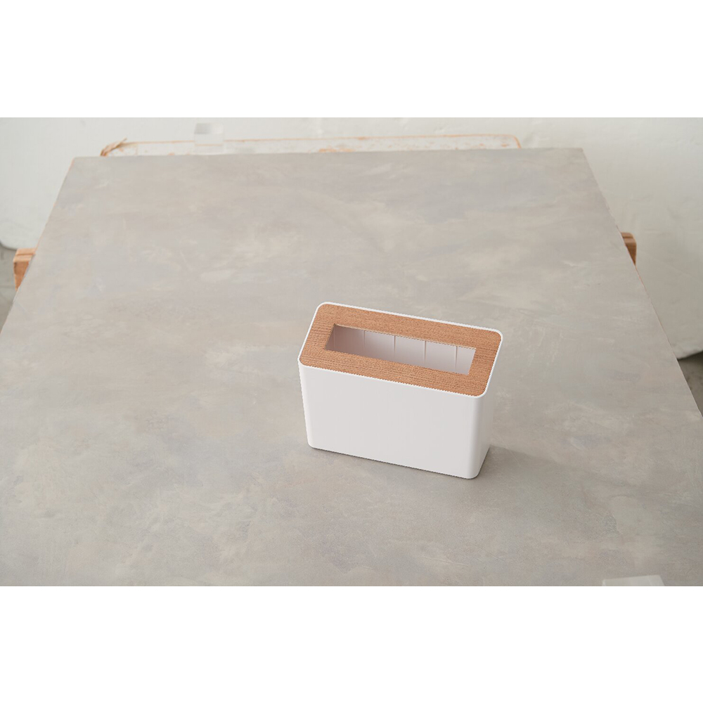 洗面台やデスク上に木目が美しいシンプルな卓上の蓋付きゴミ箱。化粧する際のコットンや綿棒など、ゴミ箱容器が樹脂なので袋をかけずそのまま捨てられます。