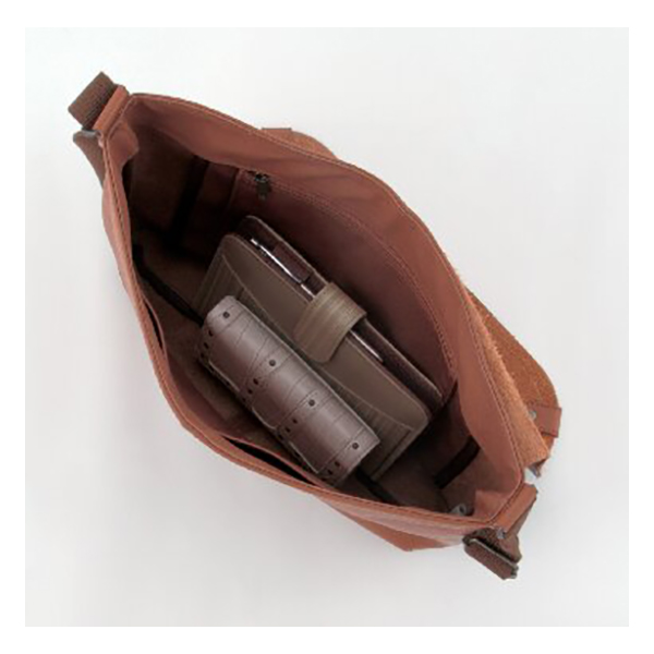 開口部:被せマグネット式、外部:ファスナーポケット1、内部:オープンポケット2・ファスナーポケット1、ショルダーベルト着脱不可(長さ調節可)。シンプルで飽きのこない牛革のメッセンジャーバッグです。