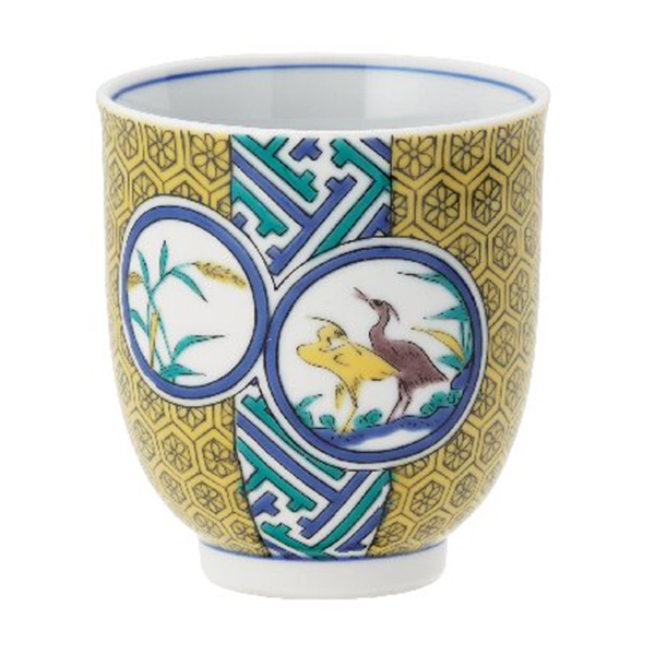 九谷焼 湯呑 亀甲文鷺の図(イエロー)