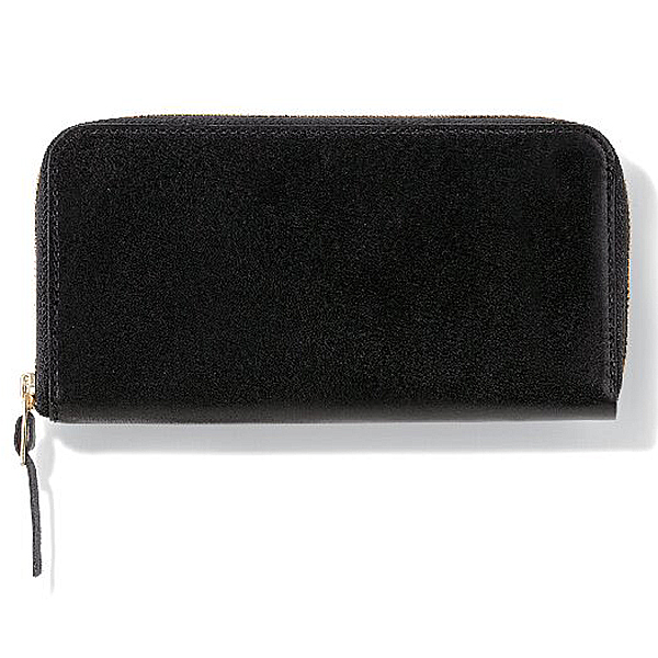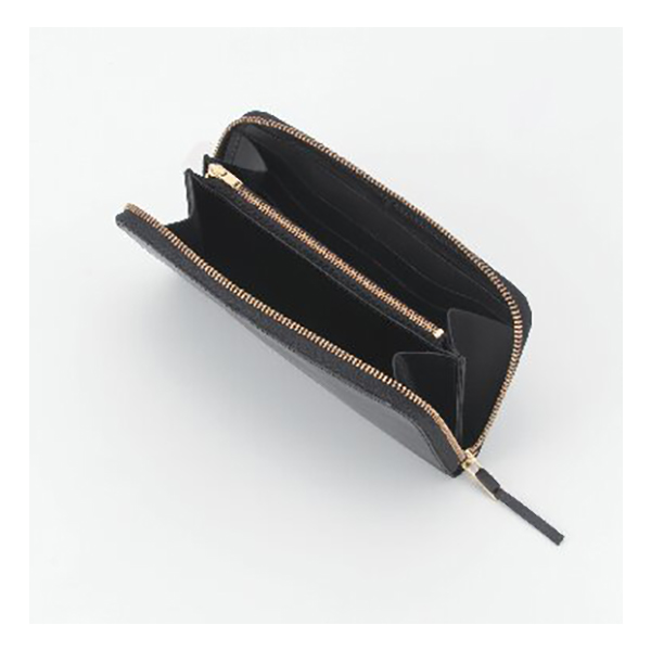 開口部:ファスナー式、内部:札入2・ファスナー式小銭入れ・カード入12・オープンポケット2。芯材を使わず革のみで仕立て上げたラウンドファスナー長財布。手作業のため色ムラや革本来の血筋などがあることがございます。