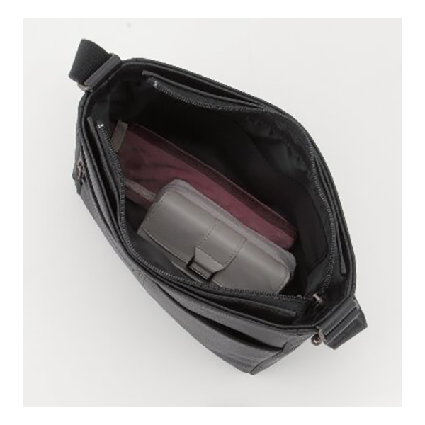開口部:ファスナー式、外部:ファスナーポケット1・マグネット式ポケット1、内部:オープンポケット1、ショルダーベルト着脱不可(長さ調節可)。職人による丁寧な仕上がりで、縦型で収納もしっかりしたショルダーバッグです。