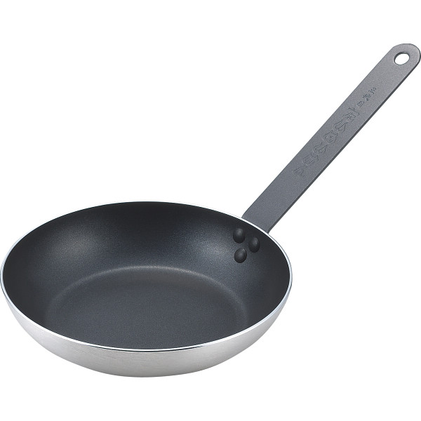 プロのこだわりはそのままに、家庭で使いやすく樹脂加工リメイクしたハイブリッドなフライパン。1番使いやすいサイズ、22cm。茂出木シェフこだわりのサイズ。トントンしやすいこだわりのハンドル角度。プロと同じ丈夫な鉄製。卵をまとめやすいフチの形状。軽量で扱いやすいアルミ製。内面はフッ素樹脂加工でお手入れ簡単。